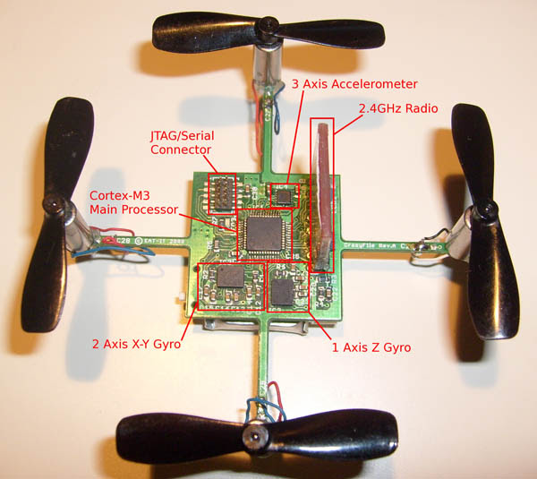 If the ccTLD is correct, this remarkable CrazyFlie micro-quadcopter project originates from—or is at least hosted on a server in—the South Pacific island nation of Niue. The video reports a 20 gram weight, a 4.5 min flight time using the battery on the underside of the board, and a 12×12 cm footprint. [via adafruit]